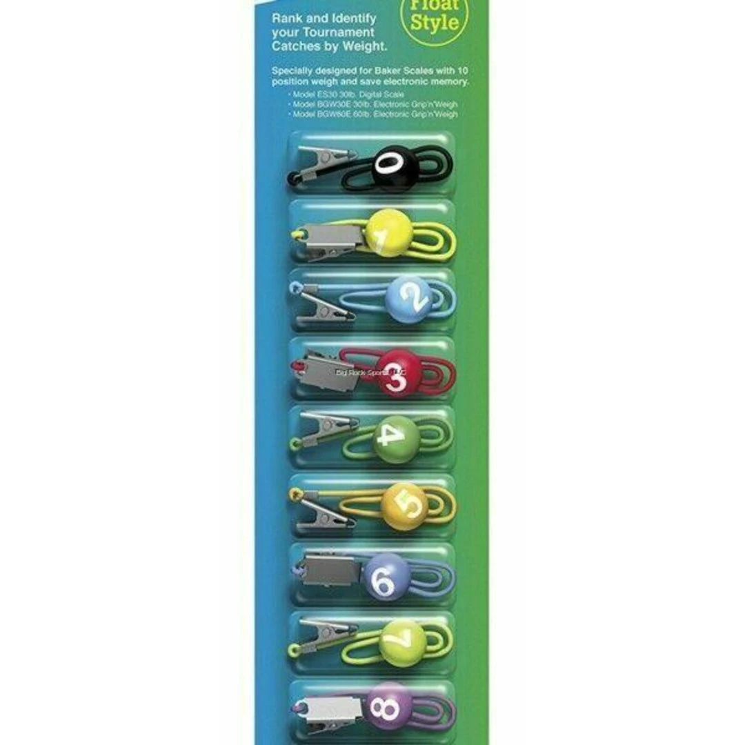 Offering tournament-class culling, the Baker Culling Kit gives anglers an easy way to rank and identify fish with its brightly colored 10-piece system. Designed to work hand-in-hand with the Baker Electronic 30lb Scale and the Baker Grip N Weigh 30lb Electronic Scale, the culling tags in the Baker Culling Kit are numbered from 0-9 to match the digital memories of both scales for quick and easy use.