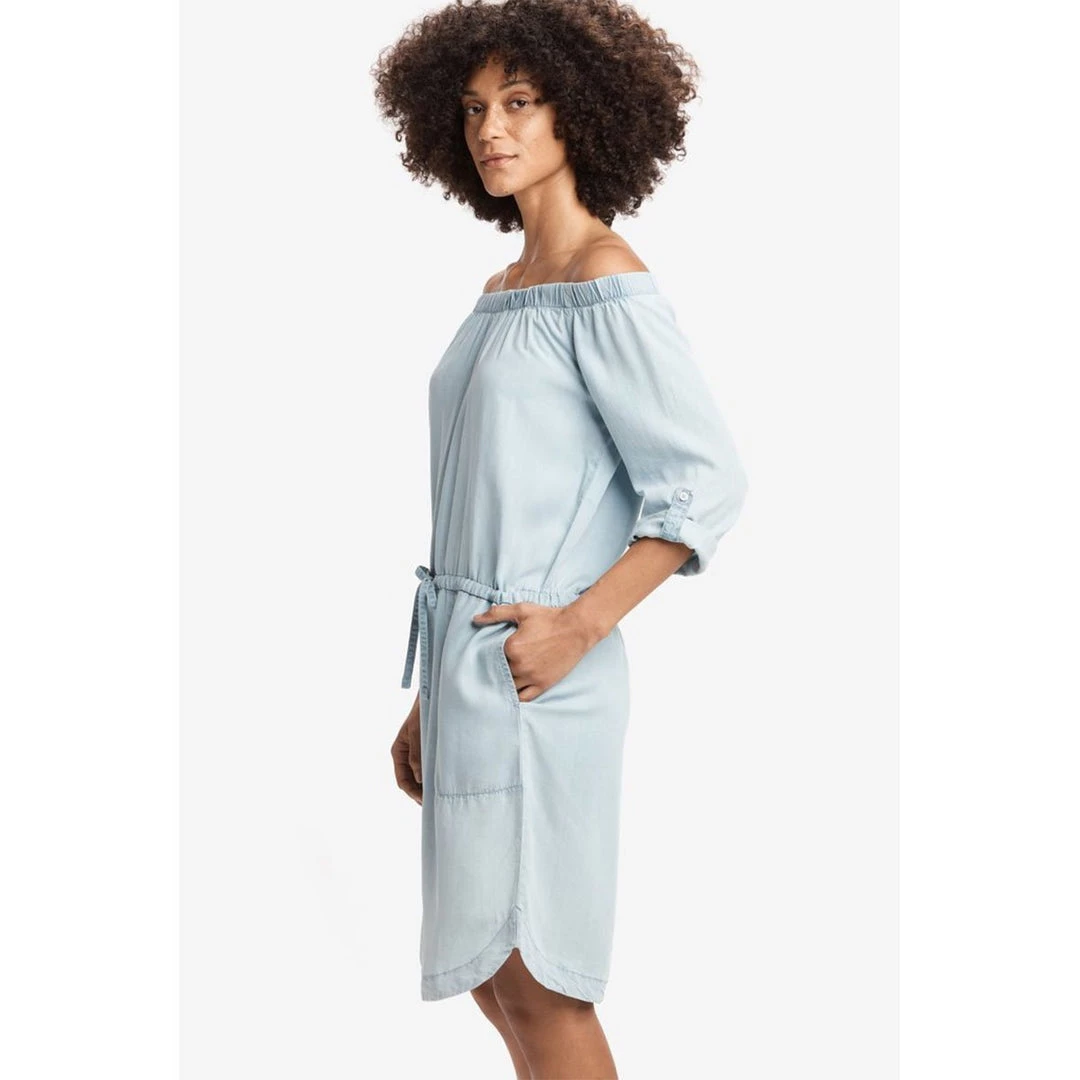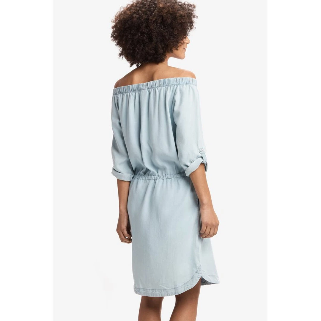 For a casual and feminine summer look, add this dress with fold-up sleeves to your wardrobe.