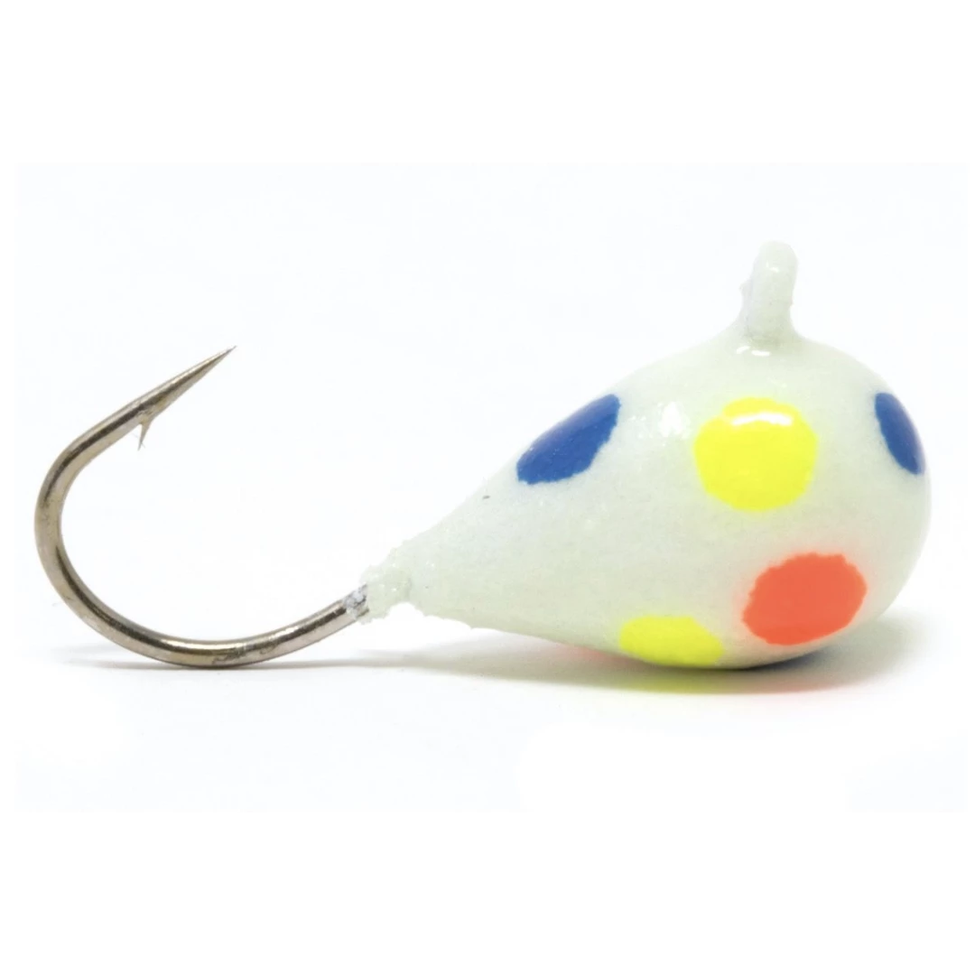 Same jig. Bigger, wider-gaped hook. When the Drop pounded onto the scene, the ice fishing world fell in love with it. You already know the tungsten craftsmanship, killer colors and angled hook orientation for better hooking percentage. But sometimes the hook itself can be a bit on the small side, when you want to bulk up with waxies, maggots or a Maki Plastic. We needed Drop jigs with bigger hooks, so we made them.