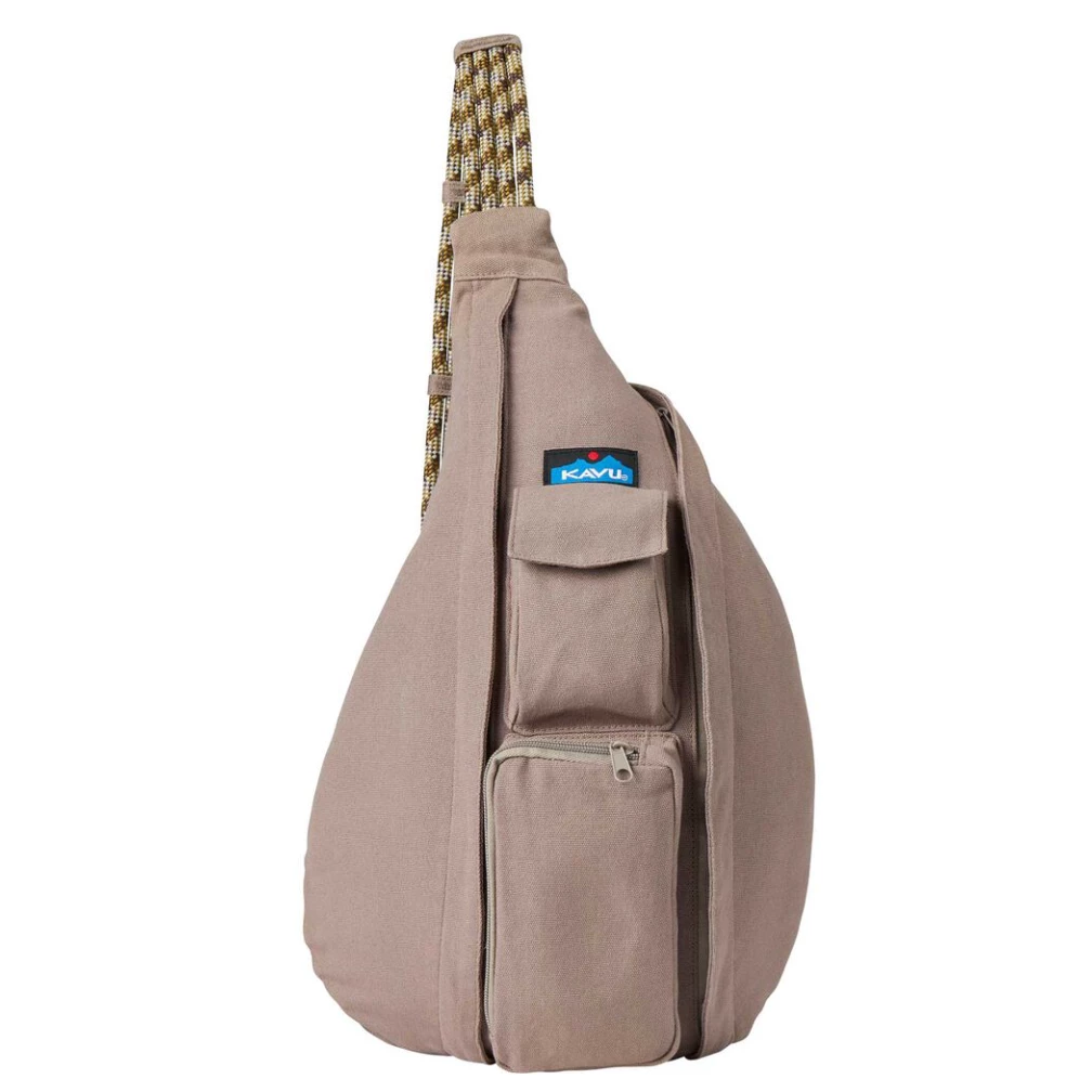 This mini sling cotton canvas pack features adjustable rope shoulder strap with side release buckle, two vertical zip compartments, two key or cell phone pockets, padded back with KAVU embroidery.