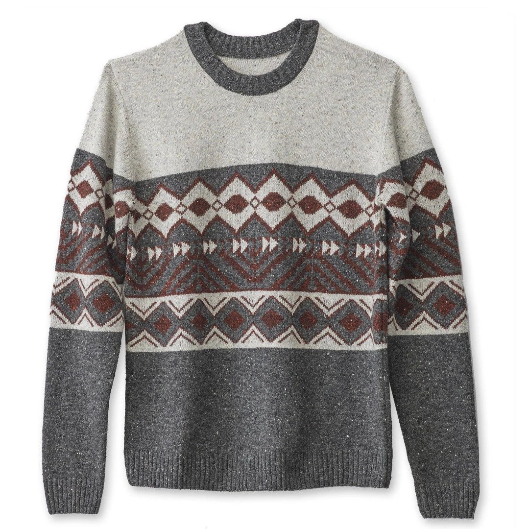 Casual fit, fully fashioned crew neck sweater, jacquard pattern across chest and sleeves, ribbed collar, cuff and hem.