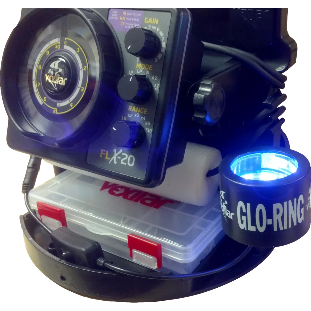 Using special UV LED’s anglers are able to glow a lure treated with glow paint with only one second of exposure inside the powerful GLO-RING light chamber. Powered by your either a direct connection to your Vexilar battery via the quick connect charging cable or it can be fully adapted to get power from any carry case with supplied gator clip adapters. Even a mounting bracket comes with the GLO-RING to install on a Vexilar Genz pack or the wall of your permanent fish house. The GLO-RING can also be used as a rod holder too!